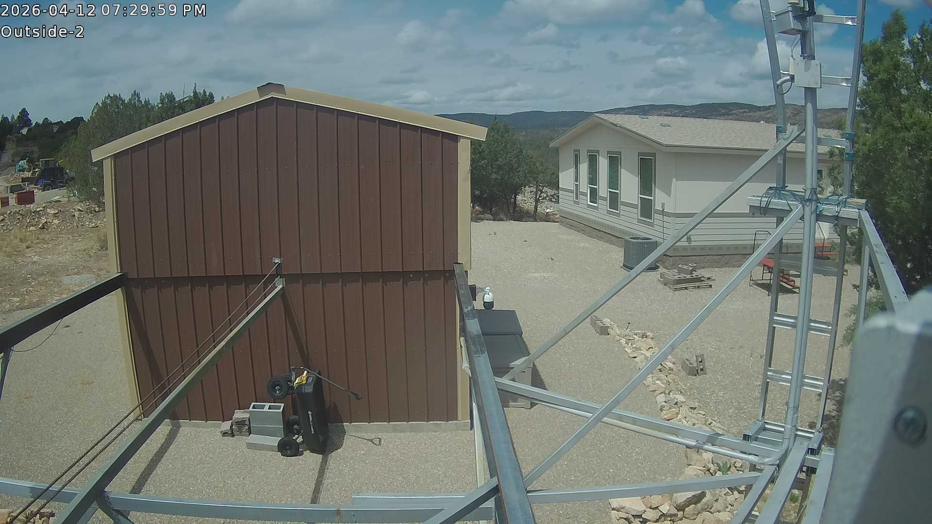 Updated every minute. North is on the bottom. Shows a ~ 180° view from the observatory, about 18 feet (5.5 meters) up. We call the start at the 5 o'clock position at night the Mayhill Star. It's a light on the mountains on the other side of the valley and is the only artificial light I can see from the front of my observatory.